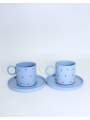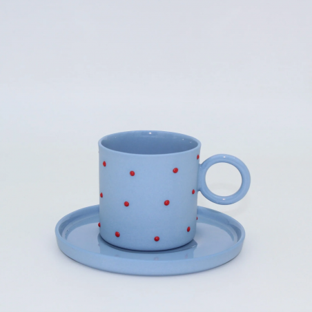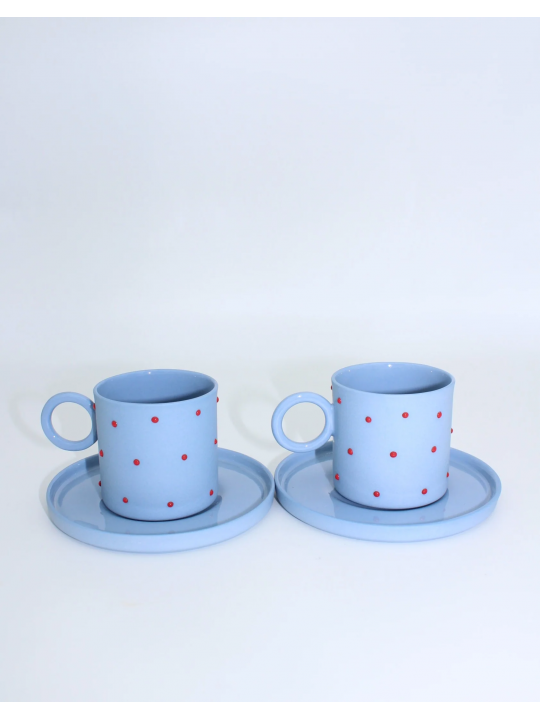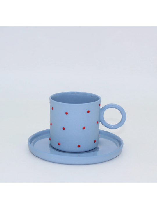 Mia Mavi - Kırmızı Noktalı Porselen Fincan ve Tabağı